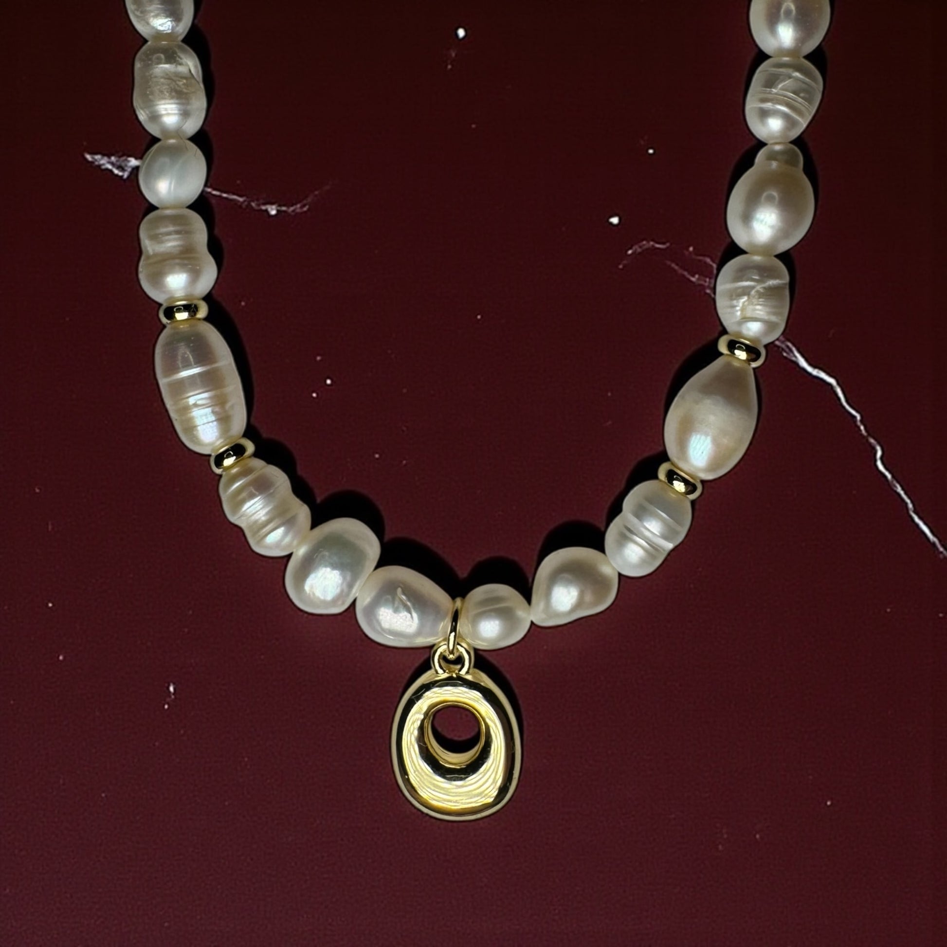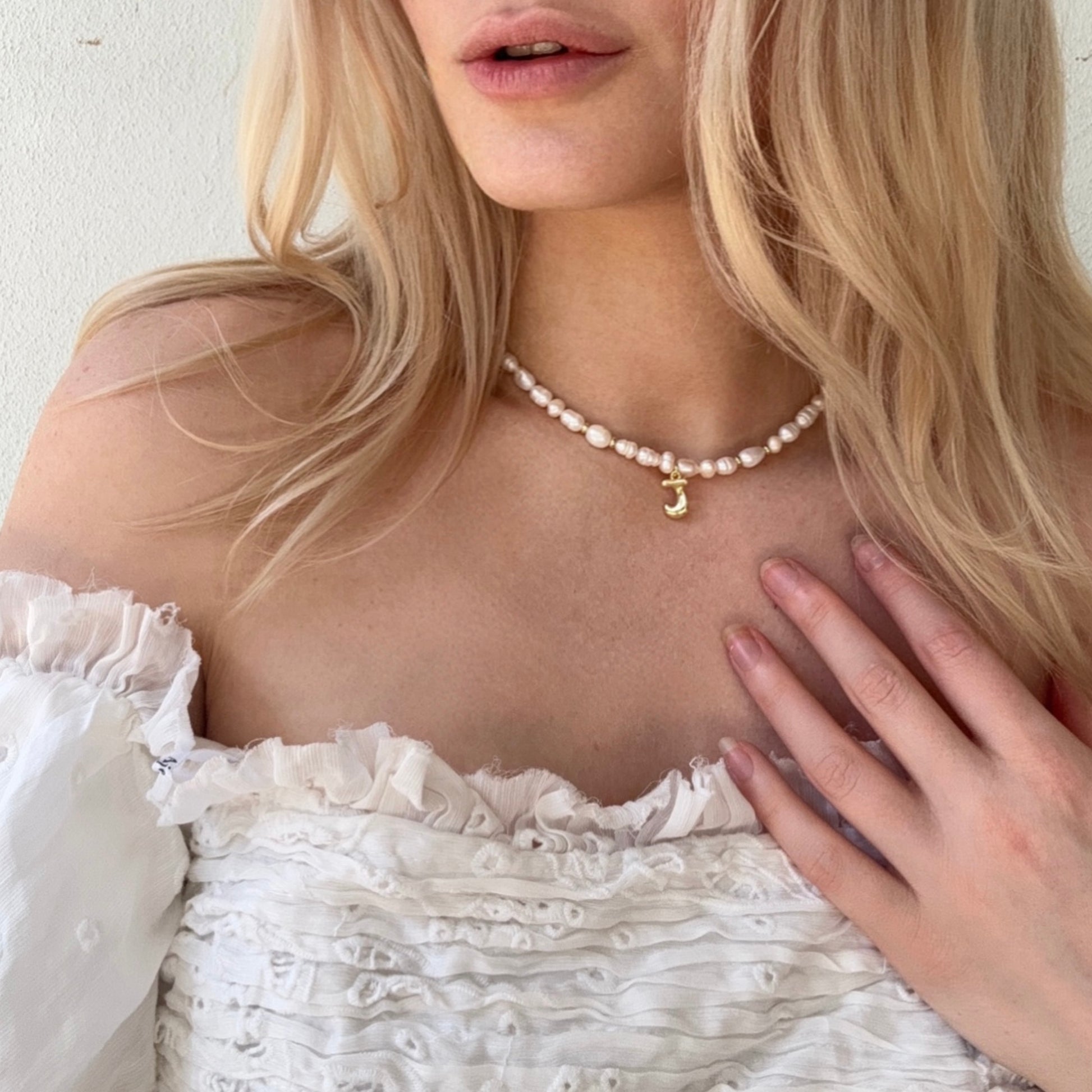 - Materials: Freshwater pearls, 18k gold filled accents, sculptural 18k gold filled initial charm